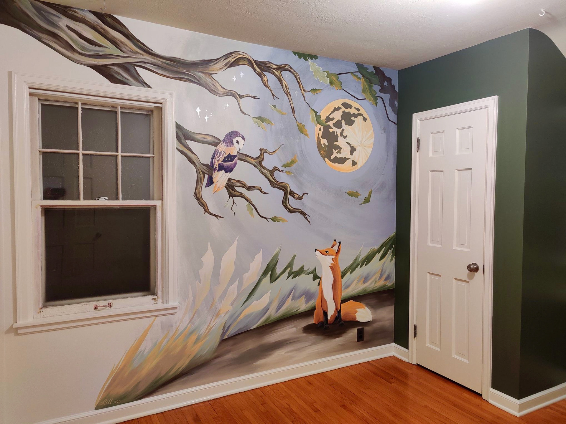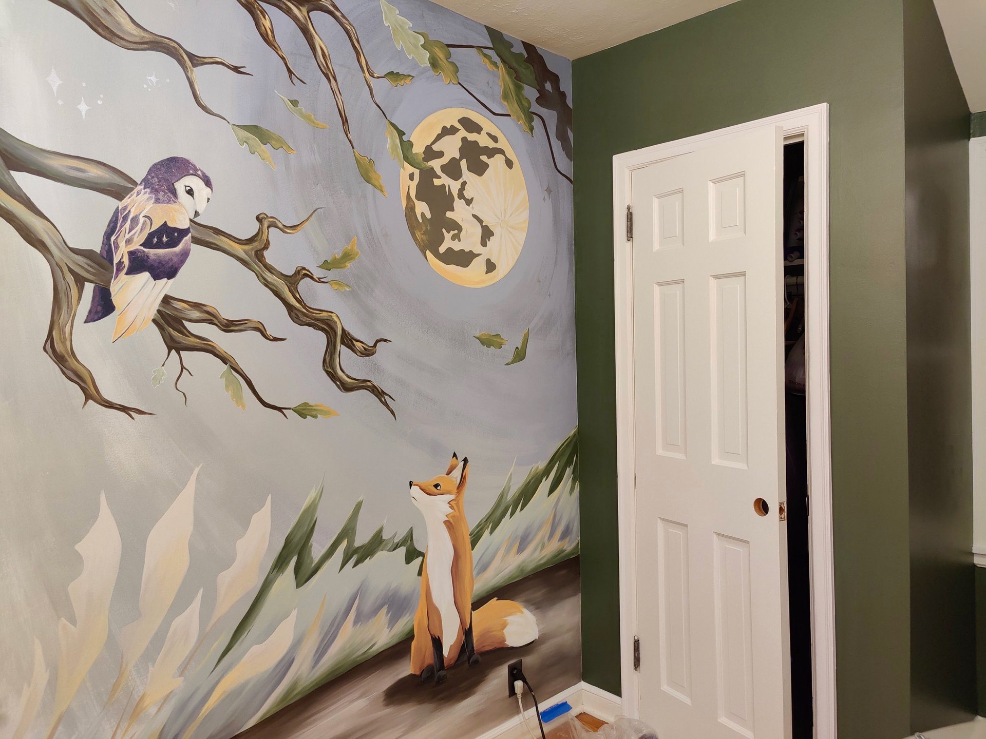 Mural designed for a baby boy's bedroom. They wanted an outdoor theme with the moon and iridescent stars. We matched the colors in the leaves to the wall color. It turned out dreamy and magical.