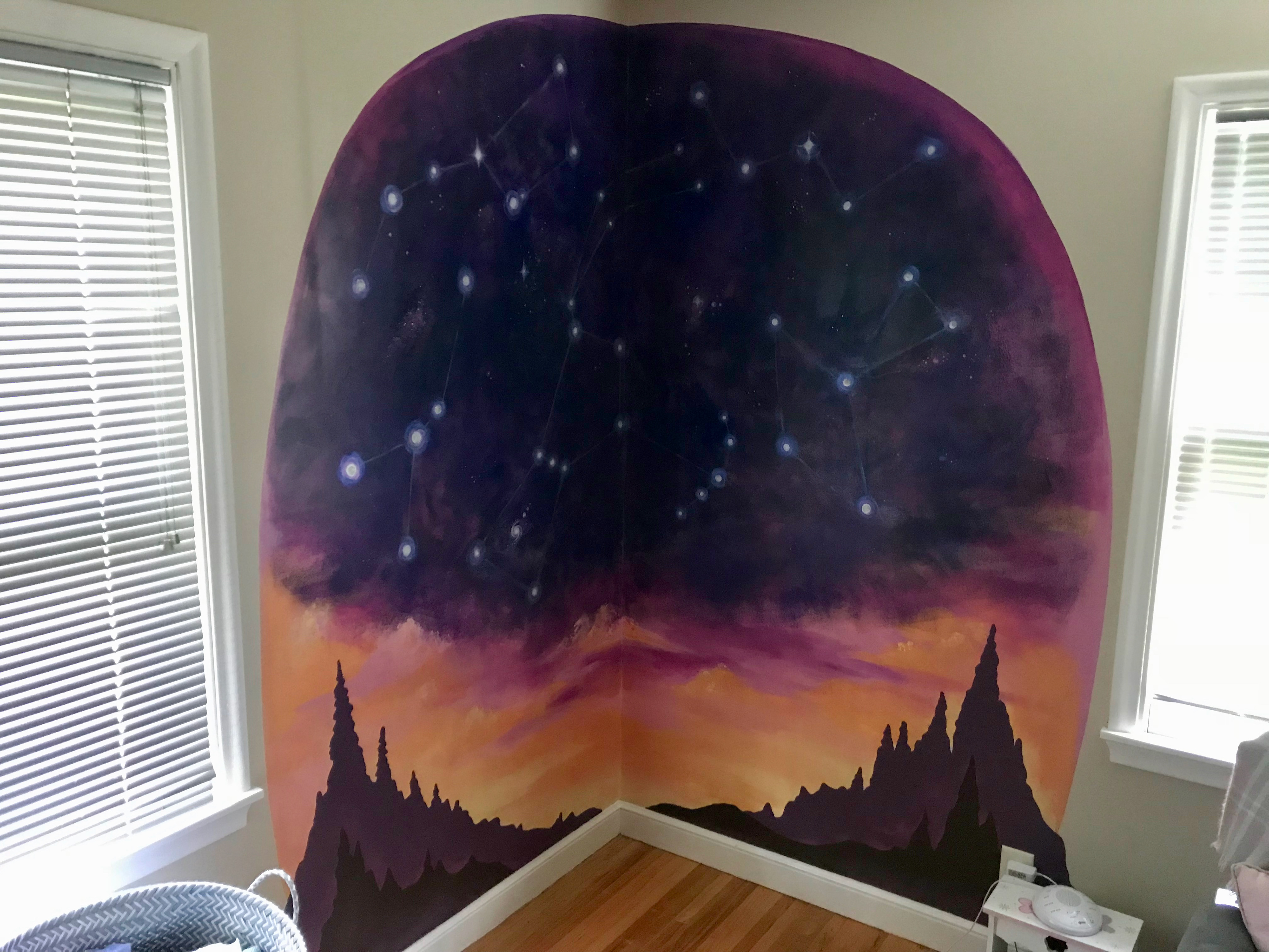 Designed for little Eva's bedroom, this mural depicts some of the most well-known constellations in the northern hemisphere, and is topped off with glow-in-the-dark paint for nighttime splendor.