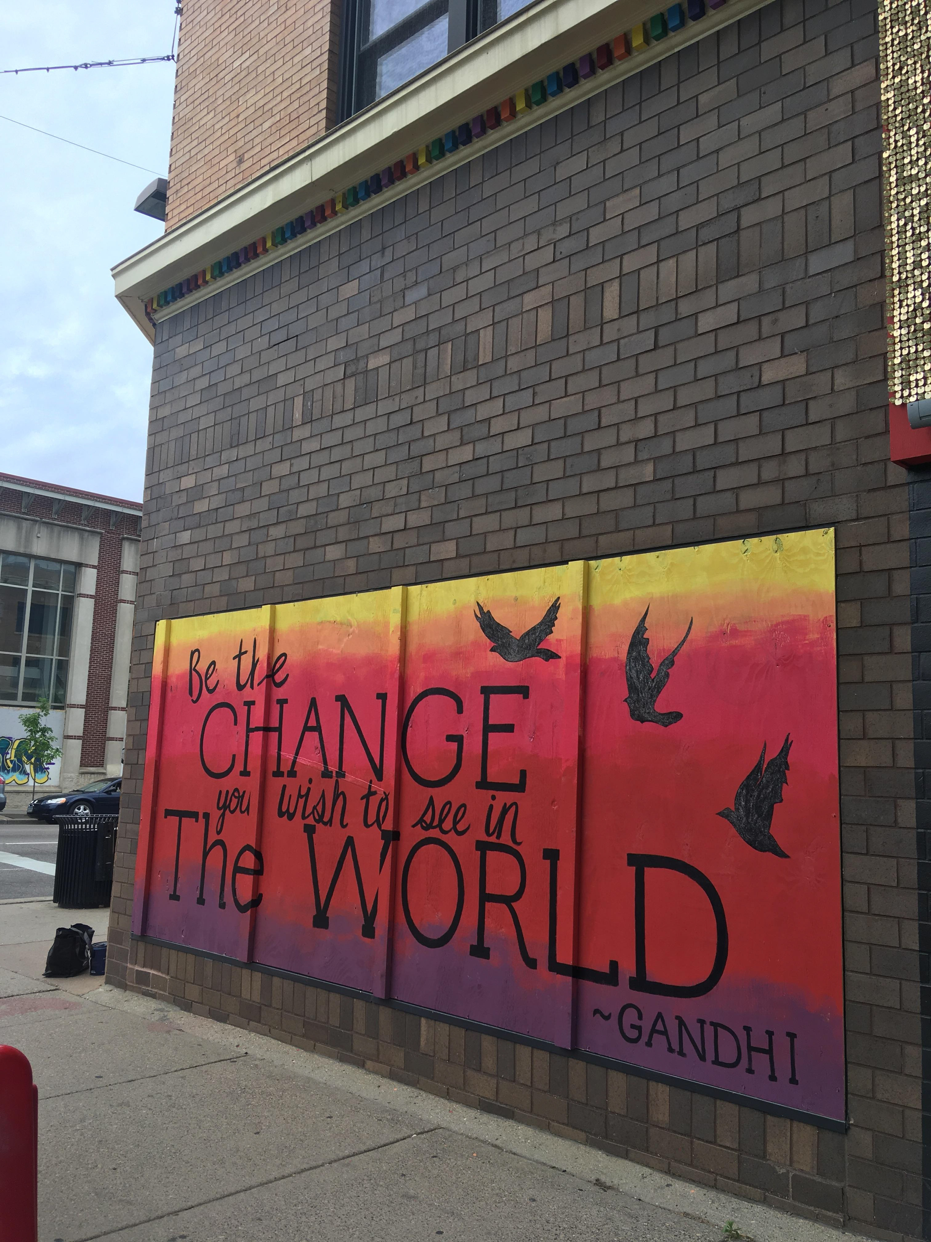 Painted in Uptown Minneapolis on the Rainbow Building, shortly after the Lake Street riots, spurred by the murder of George Floyd in May of 2020. This piece was made to inspire those to make a change and to bring peace and beauty back to a community broken by this historic tragedy.